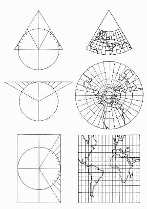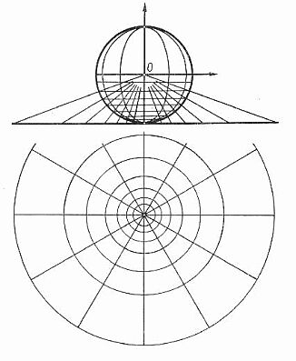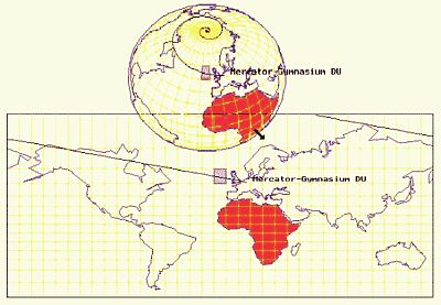ÜBRIGENS: Ob wir "Entwurf "oder "Projektion" sagen, ist so ziemlich belanglose Deutschtümelei - um sich von den Franzosen zu unterscheiden. "Projektionen" der Darstellenden Geometrie (mit ihrer Perspektive) vorzubehalten, "Entwürfe" aber der allgemeinen Kartenlehre zuzurechnen, ist mathematisch wenig sinnvoll, da es sich in beiden Fällen - abgesehen von singulären Punkten - um eineindeutige Zuordnungen von Kugelpunkten zu Punkten der Ebene (umkehrbaren Abbildungen) handelt. |