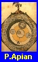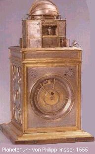 Zuerst habe ich diese Angabe für un-passend - zu meiner Geschichte gehalten - , aber da ich nun weiß, daß Janellus nicht nur schon 1546 zum kaiserlichen Troß gehörte, vgl. den Artikel HOMMEL, sondern mit Kaiser Karl 1529 in Pavia zusammengetroffen ist, passen sogar an die 25 Jahre Vor-Arbeit durchaus: Als Karl V. 1529 in Pavia war, interessierte er sich brennend für die astronomische Uhr des Giovanni de' Dondi aus Padua, die der Graf Giangaleazzo Visconti in seiner Bibliothek in Pavia augestellt hatte. Giovanni de' Dondi hatte zwischen 1348 und 1364 eine Art Planetarium - "astrarium" genannt - aus fein gearbeiteten Zahnrädern aus Messing hergestellt - und mit einem komplizierten Getriebe versehen - , das der mechanischen Darstellung des ptolemäischen Universums diente. Karl beauftragte damals den Janellus, die stark korrodierte Uhr wieder herzustellen. Als dies nicht gelang, gab Karl dem Janellus den Auftrag, eine ähnliche Uhr für ihn herzustellen. Es dauerte aber noch 25 Jahre, bis Janellus ein Zwischenresultat seiner Arbeit in Brüssel - durchaus (wie es scheint vom Ende her gesehen:) noch unfertig - präsentieren sollte | konnte. Darstellungen In der Leichenrede des Erhard Cellius auf Philipp Apian heißt es, daß der Kaiser in seinem Feldlager und inmitten eines tobenden Krieges der Theorie der Sterne nachging und über die Gesetze der Himmelsbewegungen und deren Periodizitäten nachdachte. Kaum aber da er das Feldlager in der Nähe der Stadt aufgeschlagen hatte, ließ er Peter Apian zu sich rufen. Dieser führte dem Kaiser die von ihm verfertigte machina - die als Kreisscheiben dargestellten umlaufenden Sphären (orbes), die einzelnen Bewegungsformen der Planeten darstellend - sorgsam und im einzelnen vor. Im Feldlager vor Ingolstadt hatte Peter Apian damit die großartige Möglichkeit, die in seinem dem Kaiser gewidmeten Astronomicum Caesareum enthaltenen "Maschinen" selbst vorzuführen. Das Astronomicum enthält 21 dieser "Maschinen", d.s. astrolab-ähnliche Figuren, auf die drehbare Pappscheiben aufgesetzt sind, die den Sonnen- und Mondstand sowie die Bewegungen der einzelnen Planeten - oder auch z.B. den Wochentag eines beliebigen Datums ermitteln helfen - beschreiben sollen.