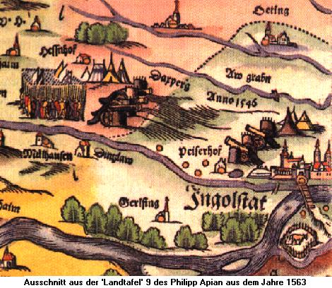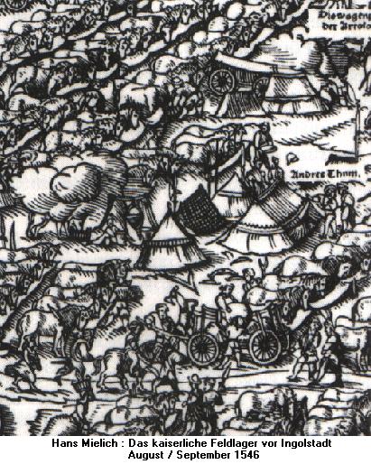 'Cum Caesar die 26.Aug.(Anno 1546) in bello Germanico castra ad Ingolstadium posuisset, Prostestantes continuo triduo bellicis tormentis, quae bomdardos vocant, bis mille septingentos sexaginta octo globos in Caesarianos emiserunt. Hic cum C.Julii exemplo Carolus in //426// ipsis castris et medio belli ardore siderum doctrinam coleret, ac revolutionum coelestium leges et periodos consideraret, Petrum Apianum in castra, vix dum posita et urbi vicina evocavit, ut in machina à se facta, |
