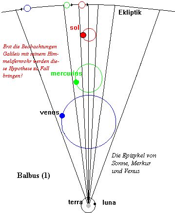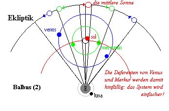 Erde-Mond-Merkur-Venus-Sonne-Mars-Jupiter-Saturn. göttliche Funktion der Sonne Die Erkenntnis, daß die übermächtige Sonne "irgendwie“ alle Planeten "anführt“ und ihren Lauf beherrscht, führte zwischen 200 v.Chr. und 200 n.Chr. dazu, das alle Planeten beherrschende göttliche Gestirn in die "Mitte“ der Reihe der Planeten - inklusive Mond - zu plazieren, Merkur und Venus also unter die Sphäre der Sonne zu setzen. Die Sonne wurde damit - im übertragenen Sinne - die "Mitte“ des Weltalls (medium coeli) : wie das Herz im Menschen - im übertragenen Sinn - : nur "ein wenig höher“ als seine "wahre“ Mitte der Welt (Erde = Nabel = medium mundi). Immerhin blieb die "wahre“ Mitte des Weltalls, ihr Nabel zu sein, noch für anderthalbtausend Jahre der Erde beschieden. Eine Bestätigung für diese Annahmen lieferte schon im 400.Jh.n.Chr.Villius Firmicus Maternus (nach 340), der als junger Mann - "noch Heide“ - diejenigen Werke antiker Schriftsteller zusammenstellte, die sich mit astrologisch-astronomischen Fragen beschäftigten. Aratos und Cicero befanden sich genau so gut in dieser Sammlung, die er als libri VIII matheseos titelte, wie Manilius, Germanicus, Avienus, Theon (der Alexandriner) oder Proklos: Julii Firmici Astronomicorum libri octo integri, & emendati, ex Scythicis oris ad nos nuper allati. ... Venetiis cura et diligentia Aldi Romani mense Octobr. 1499, fol. I,4 schreibt Firmicus - Ciceros Worte förmlich wiederholend - : Du beste und größte Sonne, die du die mittlere Sphäre des Himmels innehast, Seele [mens] und ordnendes Prinzip der Welt, Anführer aller Gestirne und Fürst, die du das Feuer der übrigen feurigen Sterne mit der Herrschaft deines Lichtes unterhältst. Abstand Nach heutigen Vorstellungen liegt der maximale Abstand Venus-Sonne zwischen 45° und 48°: nie mehr als zwei Sternzeichen (60°) ist für einen Nicht-Astronomen dann als eine "gute“, wenngleich grobe Annäherung anzusehen, so wie für den Merkur nie mehr als ein Sternzeichen (30°) als eine erste Näherung für 24° bis 20° Entfernung (von der mittleren Sonne) angesehen werden kann. Entscheidung Zwei durchaus unterschiedliche Vorstellungen können in diesem Zusammenhang vertreten werden: eine, und eine zweite, Balbus I und ?Macrobius