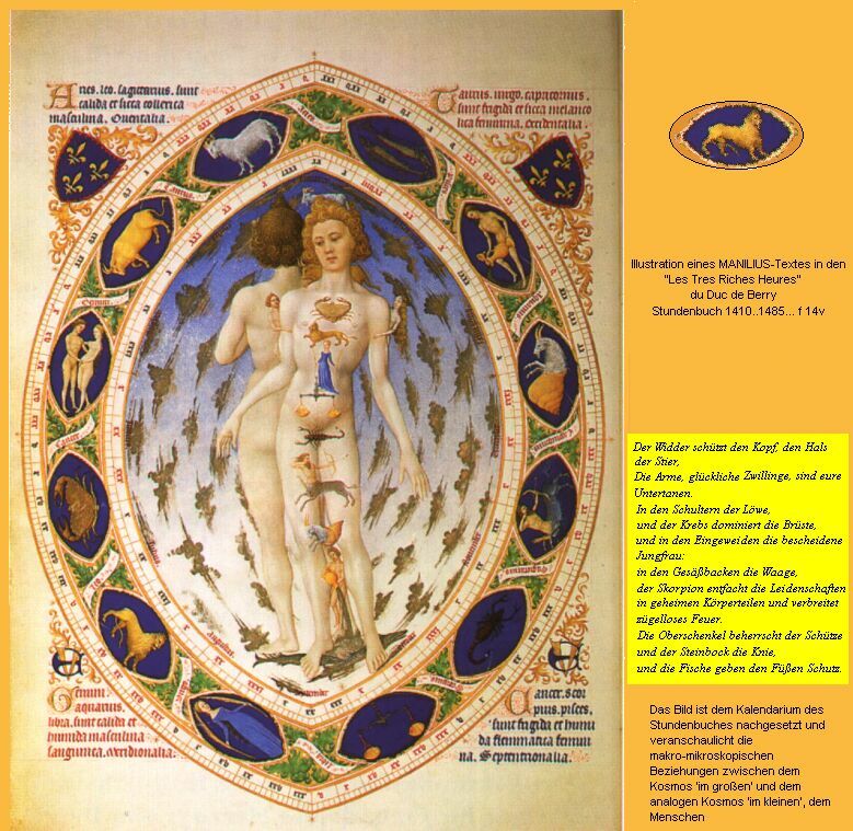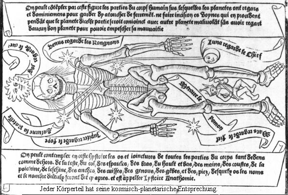 Stoikern Und auch von Cicero. De natura deorum 2, 37 heißt es: Ipse autem homo ortus est ad mundum contemplandum et imitandum - nullo modo perfectus, sed quaedam particula perfecti, der Mensch ist aber erschaffen, um das Weltall zu betrachten und nachzuahmen [alle anderen Dinge sind für andere Zwecke entstanden], gewiß: nicht als vollkommenes Wesen, aber doch als ein kleiner Teil des Vollkommenen. Mittelalter So enthält z.B. das Liber Divinorum Operum, das Buch der göttlichen Werke, der Hildegard von Bingen (1098-1179) eine Fülle von Aussagen über den Kosmos, den Menschen und die vielfältigen Beziehungen zwischen dem Makrokosmos (Weltall) und dem Mikrokosmos (Mensch). vertreten Vgl. z.B. Kosmographische Gedanken, Anmerkung II.12: 9. Analogie ![]() Körper ![]() ägyptische Reihenfolge Timaios: Erde-Mond-Sonne-Venus-Merkur-Mars-Jupiter-Saturn:Plato hat sich in diesem Punkte ausnahmsweise nicht nach den Pythagoräern gerichtet. (Van der Waerden: Astronomie 52)