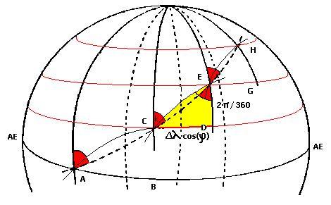 Ein Schiff segele im 4.Strich = 45° von 38°N hinauf nach 40°N. |