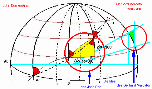 Da John Dee nicht - wie ?später Gerhard Mercator - gefragt hat: Wie muß die Plattkarte konstruktiv verändert werden, damit in jeder Breite die vera similitudo vel ratio - die wahre Ähnlichkeit oder das wahre Verhältnis - zum Äquator eingehalten wird ?sondern allein bei vorgegebener Breite |